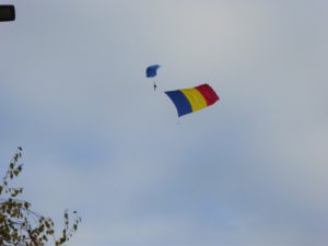 Dann fingen vermutlich wichtige Personen der Stadt an, Reden zu halten und ein orthodoxer Priester ging, Weihrauchdöschen schwenkend auf und ab, während er segnende Worte vor sich hersang. Das Ganze wurde uns ehrlich gesagt auf Dauer etwas zu langatmig und die Kälte tat ihr übriges, sodass wir uns gerade auf den Heimweg machen wollten, als wir oben am Himmel in weiter Ferne etwas entdeckten. Es entpuppte sich als ein Fallschirmspringer, der munter auf das Zentrum der Festivitäten zuflog, ca. 100 Meter über dem Boden seinen Fallschirm zog und ein riesiges Tuch entfaltete. Der geneigte Leser wird – genau wie wir – sicher eine Vorahnung haben, was für eine Art Stoff das war und was soll ich sagen; wir wurden nicht enttäuscht. Es handelte sich tatsächlich um eine riesige Flagge in den Farben Blau, Gelb, Rot. Nach dem was ich gehört habe, steht das Blau übrigens für den freien Himmel und die Freiheit, das Gelb für das Land, die Felder und die Gerechtigkeit und das Rot für das Blut und die Bruderschaft (Quelle: https://ro.wikipedia.org/wiki/Drapelul_României).