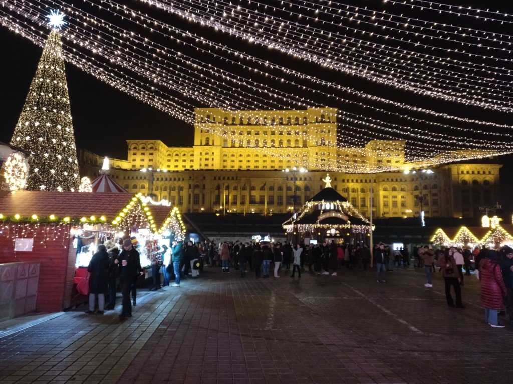 Weiter → Blick vom Weihnachtsmarkt auf den „Palast des Volkes“ (der riesige Prunkbau aus Ceaușescu-Zeiten, in dem nun das Parlament sitzt).