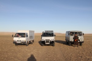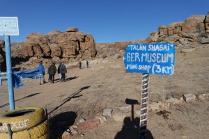 Pünktlich (wie in der Schule) saß ich also um fünf nach neun im Russenbus und der Trip in die Gobi konnte beginnen. Mit am Start waren noch Gregor (Erdenet-Freiwilliger), Anna, Kirsten, Maren, Jessy, @le__art (UB-Freiwillige), Flo (Kas-Praktikant 1), Tseegii (unser Guide) und unsere 2 Fahrer, Bataa und Naraa. Hier stellte ich fest, dass so vollbepackt wie ich mir vorkam wohl doch nicht war, denn ich war der Einzige der die Vorgabe wenig Gepäck erfüllte. Naja hätte ich vielleicht doch mehr als eine Hose und einen Satz lange Unterwäsche für 7 Tage mitnehmen sollen. 😀 Jonas (Kas-Praktikant 2) stieß erst am ersten Sight unserer Tour zu uns. Dieser bestand aus einer größtenteils verschütteten Naturhöhle in einer wirklich sehr schönen Felsenformation. Dort kletterten wir etwas herum und standen lange heroisch im starken Wind und blickten für uns alleine über die weite Steppe, ohne eine Menschenseele zu sehen. Danach besichtigten wir noch einen spirituellen Ort, an dem einst ein Kloster stand und nun in diesem Minital in der Wüste die ersten Bäume (Birken) der ganzen Fahrt auf den Ruinen wachsen. Danach suchten wir eine Nomadenfamilie bei der wir die Nacht verbringen konnten, wir fanden zwei Nomaden die etwas von Altrockern hatten. Der eine spielte sogar Schlagzeug was sehr fancy ist. Alleine die Vorstellung wie er sein Drumset vor seinen 3 Jurten und den Felsen aufbaut und nirgendwo im irgendwo drauflostrommelt, wollte nicht in meinen Kopf. Desweitern besaßen sie eine Jurte in der sie selbstgejagte und ausgestopfte Tiere ausstellt. Die insgesamte Szenarie war sehr beeindruckend und wurde auch nicht dadurch getrübt, dass ich vor 6 Jahren nur 2 Nomaden weiter (10km) geschlafen habe. Nachdem ich erfolglos versucht habe kleine Ziegen zu fangen (und nur die Herde verstört hab) schliefen wir zu neunt unter beeindruckenden Sternenhimmel auf dem Jurtenboden.