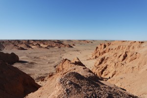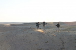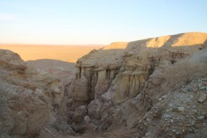 Am nächsten Tag legten wir nach nicht sonderlich langer Fahrt eine ausgiebige Pause ein, da die „Straße“ (eigentlich fuhren wir durchgehend auf Piste, also irgendwelchen Spuren durch die Landschaft) die Motorkühlung eines Busses zerlegt hat. Nach kurzer Reperaturpause fuhren wir weiter zu einer kleinem Klosteranlage. Eigentlich war das Kloster ein überdimensioniertes Ger (in der ein weiteres normales Ger stand :D). Es lebten auch nur noch sieben Lamas dort, von denen wir aber keinen sahen. Insgesamt machte es einer eher verlassenen Eindruck. Dort sammelten einige von uns, wie ich, ein paar schöne Steine die als Überreste eines Mosaiks herumlagen. Wie sich später herausstellte haben wir sie wohl eher gestohlen und allein besondere vier meiner Steine sollen in China über hundert Euro wert sein, desweitern könnte es Ausreiseprobleme damit geben, aber alles total хамаагүй (egal). Später am Nachmittag veranstalteten unsere Fahrer auf einem unendlich weiten und flachen Abschnitt der Wüste ein Rennen. Dort heizten sie mit über 120 durch diese ewige Flachland. Wohlgemerkt auf komplett unbefestigten Straßen, dabei wurde das dauernde Rütteln durch zeitweise Abschnitte der Schwerelosigkeit ergänzt. Die Hauptattraktion diesen Tages waren ziemlich krasse Sandformationen, die durch Regen geformt worden waren. Diese kamen ziemlich aus dem Nichts und thronten über einer weiten Ebene. Dort tobten wir uns reichlich aus und genehmigten uns unser Feierabendbier. Danach fuhren wir im Sonnenuntergang zu unser Nomadenfamilie, welches zu wunderschönen Bildern führte.