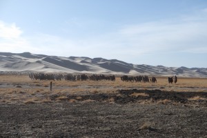 Der Kamelritt entpuppte sich als etwas frostig, aber sehr entschleunigend. An einer relativ hohen Stelle der Düne (etwa 100-150 Meter) stiegen wir ab und erklommen den Sandberg. Allgemein wirkte die Düne sehr in die Landschaft eingefügt, überall ist Stein, dort ein paar Berge, hier etwas Gras und zack hat sich ein Programmierer gedacht, wie wärs mit einem gigantischen Berg Sand. Nachdem Kamelritt (apropos die Fäkalienabgabe dieser Tiere ist sehr interessant) wurden wir ins Ger der Nomaden gebeten, wo uns außer einer fetten, angebunden Hitlerkatze ( Eine Katze in der Mongolei ist selten, in Wohnung sehr selten und bei Nomaden wahrscheinlich einzigartig. Und dann hat die auch noch einen Hitlerbart… Sachen gibt’s die glaubt man kaum. :D) mongolisches Gebäck (Mehl und Fett), Arul (sehr empfehlenswerte SÜÜßigkeit), Kamelmilch, Kamelairag (Nationalgetränk normal aus vergorener Stutenmilch) auch das traditionelle Schnupfen (also nur die Männer) erwartete. Ab diesem Zeitpunkt erlebten wir immer öfter die Traditionen der Nomaden. Durch gewisse Vorschädigung wurde diesemal nicht in Kirstens Geburtstag hineingefeiert. Unverständlicherweise!