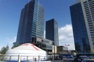 Vollbepackt verließ ich Freitagabend meine Gastfamilie und brach auf zum Kempinski-Hotel, wo genau sich dieses in UB befindet wusste ich nicht, sondern hatte nur Lennarts seeehr präzise Weg- bzw. Busfahrtbeschreibung. (Tipp für alle Menschen an den Empfangsgeräten: Fragt niemals Lennart nach dem Weg!, und wenn ihr es doch macht rechnet viel Puffer ein) Nachdem ich eine Viertelstunde fror und feststellt, dass die Busse, die ich benötigte, nicht mehr um halb zehn abends fahren, beschloss ich ein Taxi zunehmen. Taxis sind in der Mongolei alle Autos, man hält nur eine Hand heraus, irgendwer hält und los geht das Vergnügen. Ich sagte dem Fahrer „Kempinski für 5.000“ mit meinen Mongolischskills, dieser winkt und wir führen los. Es stellte sich nur ziemlich schnell heraus, dass er weder das Kempinski-Hotel kannte, noch Englisch sprach und ich ihm dem Weg sagen sollte. Da sich mein Mongolisch hinsichtlich der Richtungen leider auf geradeaus begrenzt und ich auch nicht sonderlich genau wusste wo das Kempinski liegt, hatten wir zwei einen Heidenspaß zusammen. Es machte uns so viel Freude den Anderen nicht zu verstehen, dass wir gleich zweimal um den Chingiss-Khan-Platz fuhren, bis wir der Buslinie folgten. Ab dort sagte ich immer Чигээрээ (geradeaus) und suchte am Straßenrand mit einem leichten Anflug von Panik das Kempinski. Gerade in dem Moment als wir hilflos eine Kreuzung blockierten, erblickte ich es und der Taxifahrer drehte sich um und sagte überlegen, wie er war, übersetzt durch seine Mimik: „Aaah Khan-Hotel, sag es doch gleich, anstelle von Kempinski, Kempinski“ (Das Kempinski hat er noch verächtlich ausgestoßen und dabei gespuckt.) Während ich noch überlegte ob das Spucken eine Nachahmung von mir war oder allgemeine Verachtung für das Bonzen Kempinski, nannte er mir einen astronomisch hohen Preis von 18.000. Durch mein einschüchterndes Aussehen und grobschlächtiges Auftreten (haben sich die viele Carbs und Jugend-Debattiert mal wieder nützlich gemacht) hab ich am Ende nur 6.000 gezahlt und ich glaube wir dachten beiden ein gutes Geschäft gemacht zu haben.