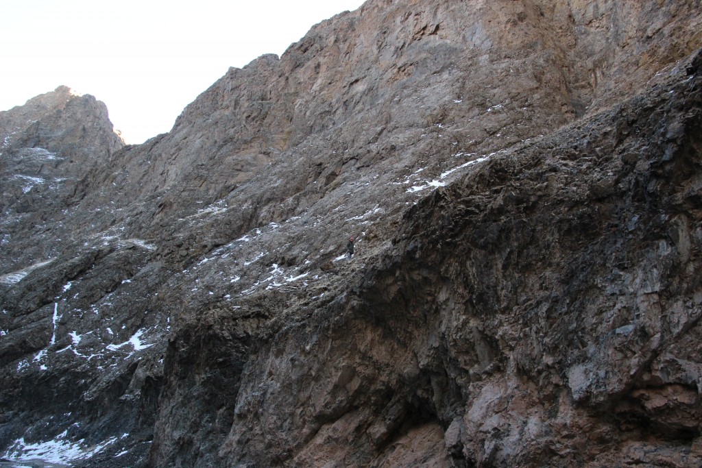 Aber beginnen wir von vorne. Die Geierschlucht ist eine tiefe und enorm steile Schlucht in den letzten Ausläufern des Altai-Gebirges in der Gobi. In dieser Schlucht fällt teilweise keine Sonne und so entstand ein Gletscher im Inneren, mitten in der Wüste wohlgemerkt. Desweitern kann man in diesem Naturpark Geier, wer hätte es gedacht, wilde Bergschafe, Steinböcke, mehrere Greifvögelarten und noch weitere Tiere in freier Wildbahn sehen. Auch Schneeleoparden sollen in dem Naturpark leben, sehen ist bei diesen jedoch eher selten. 😀 Wir entdeckten auf der Fahr bis zur Schlucht schon einige Steinböcke und Wildschafe und zwar en masse. (Tseegii sagte es ist das erste Mal, dass sie hier Steinböcke sieht und wir haben gefühlt 30 Stück gesehen. Es hat doch Vorteile bei -5° zu Reisen) Danach wanderten wir durch die Geierschlucht, ich mit einem weinenden Auge, da das Eis, seit meinem letzten Besuch (vor 6 Jahren), gefühlt um einen halben Meter weg geschmolzen ist. Der Klimawandel lässt grüßen… . Trotzdem macht es Spaß und wir wanderten bestimmt 2 Stunden dort herum. Die Meisten mussten dabei feststellen, dass ihrem (Körper-)Gepäck, bei dem sie nicht so geizten wie ich, das Eis nicht immer gewachsen war. Aber hey Kneipen ist doch gesund. ;D Auf dem Rückweg hatte dieser Vincent als letzter der Gruppe eine glorreiche Idee. Er könnte doch schnell die 3 Meter hoch auf das Plateau dort klettern und dort etwas entlang laufen. Begeistert stürmte er nach oben um festzustellen, dass das Plateau vielleicht doch kein Plateau ist, sondern so abschüssig ist, dass er sich nicht aufrichten kann. Vom Übermut gepackt und mit voller Überzeugung zu seinen alpinen Fähigkeiten wählte er den Weg nach Vorne und krabbelte nochmal 5 Meter höher, ging am Felsen entlang, mit der langsam einsetzenden Gewissheit, dass ein Fehltritt 5 Meter abwärts kugeln und danach 3 Meter freier Fall auf Stein und Eis bedeutet. Die langsam aufkommende Panik wurde vom Adrenalin bis zum Abstieg in Schach gehalten. Geleitet von Gregor, der zurückgegangen war, und mit moralischer Unterstützung von Maren und Kirsten, rutschte er mehr oder weniger kontrolliert die 5 Meter ab und kletterte dann wieder herunter. Der Titel „Held des Tages“ war dadurch redlich verdient und nicht nur weil der Rest 10-15 Minuten warten musste. Nunja Talent mich in dumme Situationen hinein zu manövrieren, besitze ich unabstreitbar zu Genüge. Aber etwas Adrenalin hat noch niemanden geschadet, nicht wahr. 😀