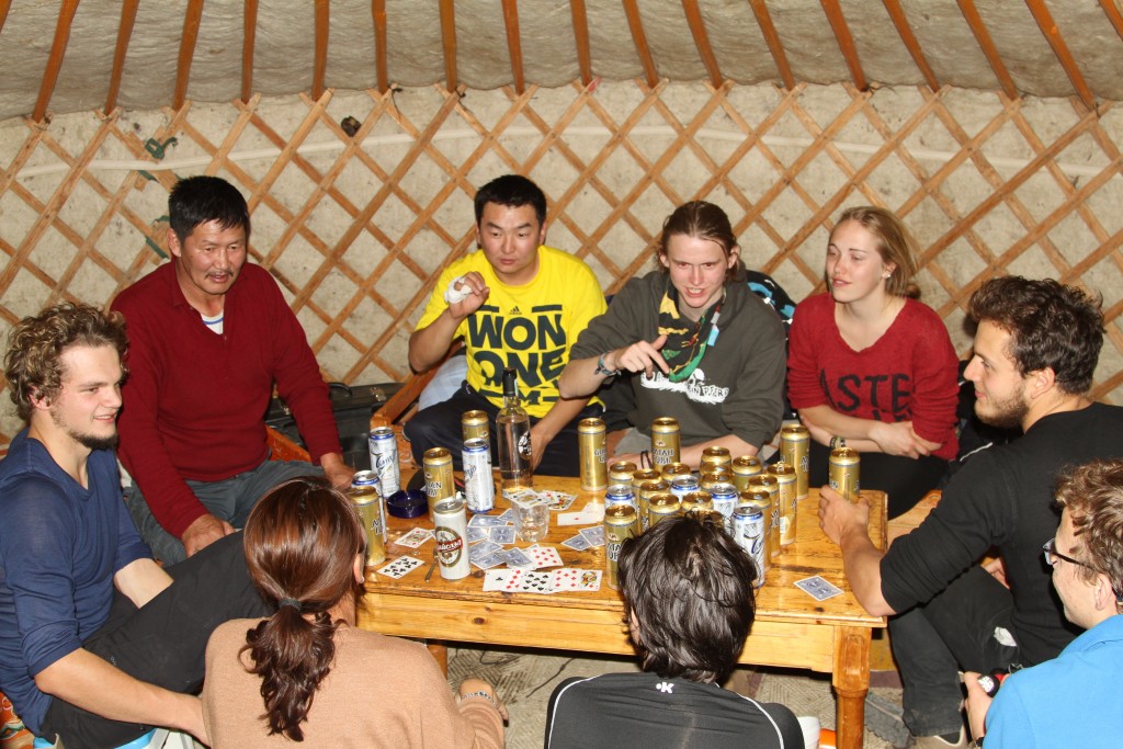 Nachdem wir wieder bei Nomaden einen Schlafplatz gefunden und zu Abend gegessen hatten begangen Jonas, Flo, Jessy (auf ihre individuelle Art und Weise :D), Gregor, Lennart (naja eine Zeit lang :D) und ich Ring of Fire zu spielen um so in Jonas seinen Geburtstag hinein zu feiern. Nach einem Ausstieg mit faden Mund ähh Beigeschmack spielte Tseegii und später auch unsere nur mongolischen sprechenden Fahrer mit. Mit viel Lachen, ein paar Schafimitationen und Wikingern verging die Zeit zum Geburtstag im Flug und Jonas durfte auf traditionelle mongolische Weise Wodka an alle verteilen.