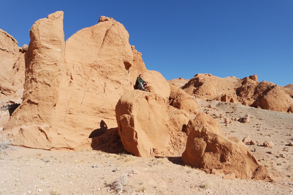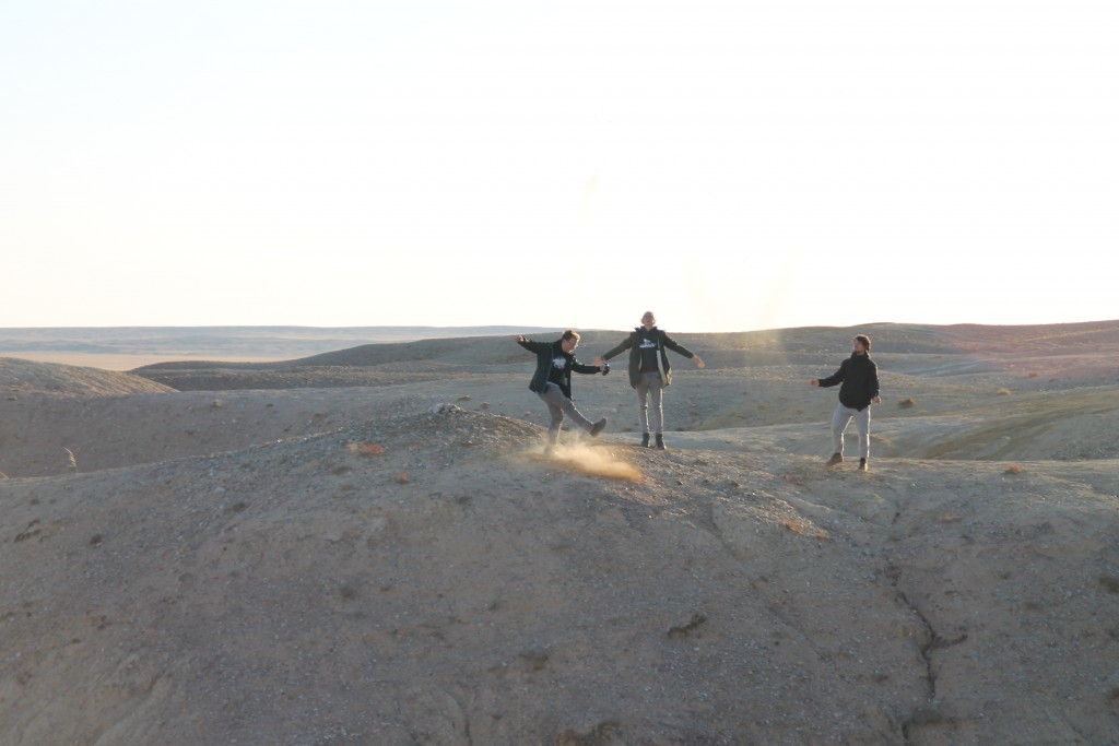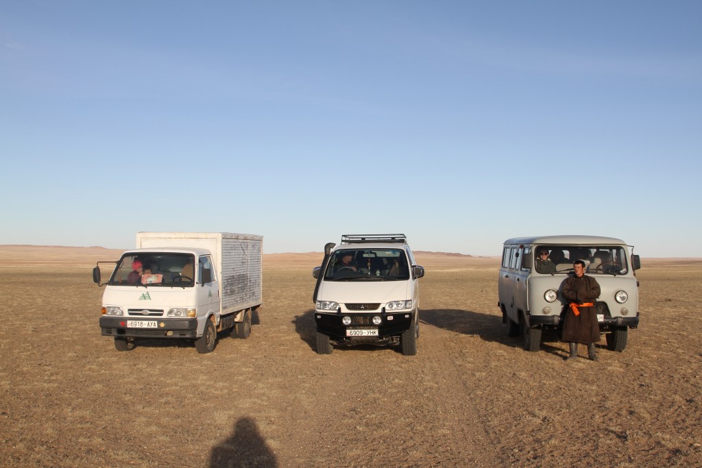 Am nächsten Tag legten wir nach nicht sonderlich langer Fahrt eine ausgiebige Pause ein, da die „Straße“ (eigentlich fuhren wir durchgehend auf Piste, also irgendwelchen Spuren durch die Landschaft) die Motorkühlung eines Busses zerlegt hat. Nach kurzer Reperaturpause fuhren wir weiter zu einer kleinem Klosteranlage. Eigentlich war das Kloster ein überdimensioniertes Ger (in der ein weiteres normales Ger stand :D). Es lebten auch nur noch sieben Lamas dort, von denen wir aber keinen sahen. Insgesamt machte es einer eher verlassenen Eindruck. Dort sammelten einige von uns, wie ich, ein paar schöne Steine die als Überreste eines Mosaiks herumlagen. Wie sich später herausstellte haben wir sie wohl eher gestohlen und allein besondere vier meiner Steine sollen in China über hundert Euro wert sein, desweitern könnte es Ausreiseprobleme damit geben, aber alles total хамаагүй (egal). Später am Nachmittag veranstalteten unsere Fahrer auf einem unendlich weiten und flachen Abschnitt der Wüste ein Rennen. Dort heizten sie mit über 120 durch diese ewige Flachland. Wohlgemerkt auf komplett unbefestigten Straßen, dabei wurde das dauernde Rütteln durch zeitweise Abschnitte der Schwerelosigkeit ergänzt. Die Hauptattraktion diesen Tages waren ziemlich krasse Sandformationen, die durch Regen geformt worden waren. Diese kamen ziemlich aus dem Nichts und thronten über einer weiten Ebene. Dort tobten wir uns reichlich aus und genehmigten uns unser Feierabendbier. Danach fuhren wir im Sonnenuntergang zu unser Nomadenfamilie, welches zu wunderschönen Bildern führte.