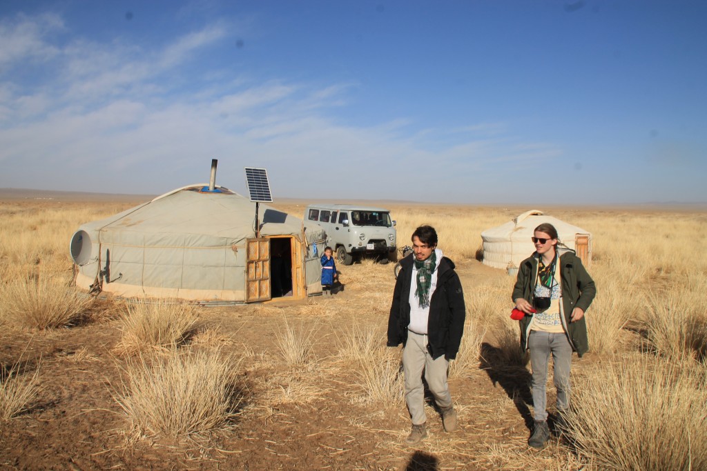 Pünktlich (wie in der Schule) saß ich also um fünf nach neun im Russenbus und der Trip in die Gobi konnte beginnen. Mit am Start waren noch Gregor (Erdenet-Freiwilliger), Anna, Kirsten, Maren, Jessy, @le__art (UB-Freiwillige), Flo (Kas-Praktikant 1), Tseegii (unser Guide) und unsere 2 Fahrer, Bataa und Naraa. Hier stellte ich fest, dass so vollbepackt wie ich mir vorkam wohl doch nicht war, denn ich war der Einzige der die Vorgabe wenig Gepäck erfüllte. Naja hätte ich vielleicht doch mehr als eine Hose und einen Satz lange Unterwäsche für 7 Tage mitnehmen sollen. 😀 Jonas (Kas-Praktikant 2) stieß erst am ersten Sight unserer Tour zu uns. Dieser bestand aus einer größtenteils verschütteten Naturhöhle in einer wirklich sehr schönen Felsenformation. Dort kletterten wir etwas herum und standen lange heroisch im starken Wind und blickten für uns alleine über die weite Steppe, ohne eine Menschenseele zu sehen. Danach besichtigten wir noch einen spirituellen Ort, an dem einst ein Kloster stand und nun in diesem Minital in der Wüste die ersten Bäume (Birken) der ganzen Fahrt auf den Ruinen wachsen. Danach suchten wir eine Nomadenfamilie bei der wir die Nacht verbringen konnten, wir fanden zwei Nomaden die etwas von Altrockern hatten. Der eine spielte sogar Schlagzeug was sehr fancy ist. Alleine die Vorstellung wie er sein Drumset vor seinen 3 Jurten und den Felsen aufbaut und nirgendwo im irgendwo drauflostrommelt, wollte nicht in meinen Kopf. Desweitern besaßen sie eine Jurte in der sie selbstgejagte und ausgestopfte Tiere ausstellt. Die insgesamte Szenarie war sehr beeindruckend und wurde auch nicht dadurch getrübt, dass ich vor 6 Jahren nur 2 Nomaden weiter (10km) geschlafen habe. Nachdem ich erfolglos versucht habe kleine Ziegen zu fangen (und nur die Herde verstört hab) schliefen wir zu neunt unter beeindruckenden Sternenhimmel auf dem Jurtenboden.
