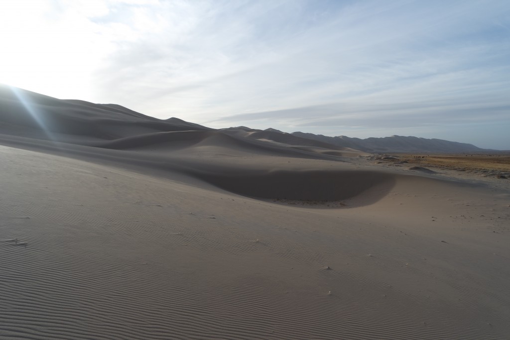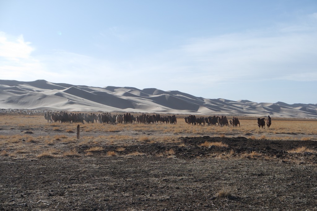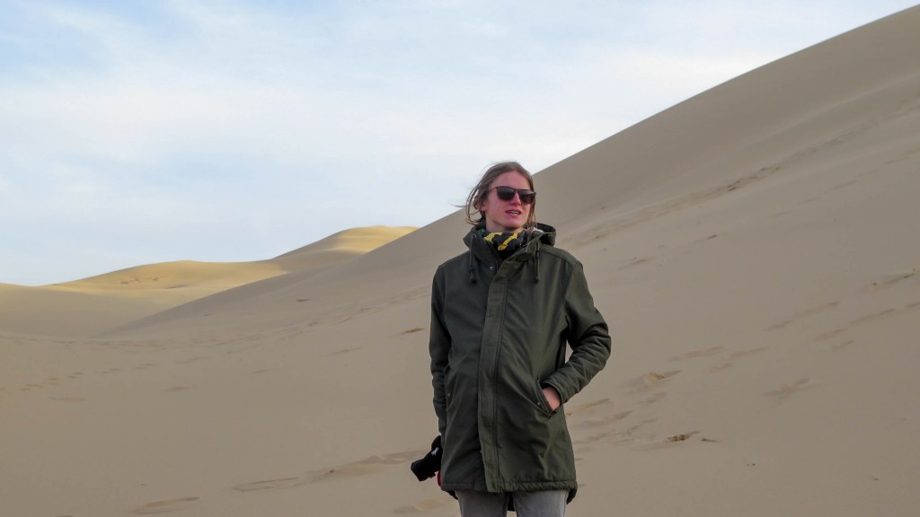 Der Kamelritt entpuppte sich als etwas frostig, aber sehr entschleunigend. An einer relativ hohen Stelle der Düne (etwa 100-150 Meter) stiegen wir ab und erklommen den Sandberg. Allgemein wirkte die Düne sehr in die Landschaft eingefügt, überall ist Stein, dort ein paar Berge, hier etwas Gras und zack hat sich ein Programmierer gedacht, wie wärs mit einem gigantischen Berg Sand. Nachdem Kamelritt (apropos die Fäkalienabgabe dieser Tiere ist sehr interessant) wurden wir ins Ger der Nomaden gebeten, wo uns außer einer fetten, angebunden Hitlerkatze ( Eine Katze in der Mongolei ist selten, in Wohnung sehr selten und bei Nomaden wahrscheinlich einzigartig. Und dann hat die auch noch einen Hitlerbart… Sachen gibt’s die glaubt man kaum. :D) mongolisches Gebäck (Mehl und Fett), Arul (sehr empfehlenswerte SÜÜßigkeit), Kamelmilch, Kamelairag (Nationalgetränk normal aus vergorener Stutenmilch) auch das traditionelle Schnupfen (also nur die Männer) erwartete. Ab diesem Zeitpunkt erlebten wir immer öfter die Traditionen der Nomaden. Durch gewisse Vorschädigung wurde diesemal nicht in Kirstens Geburtstag hineingefeiert. Unverständlicherweise!
