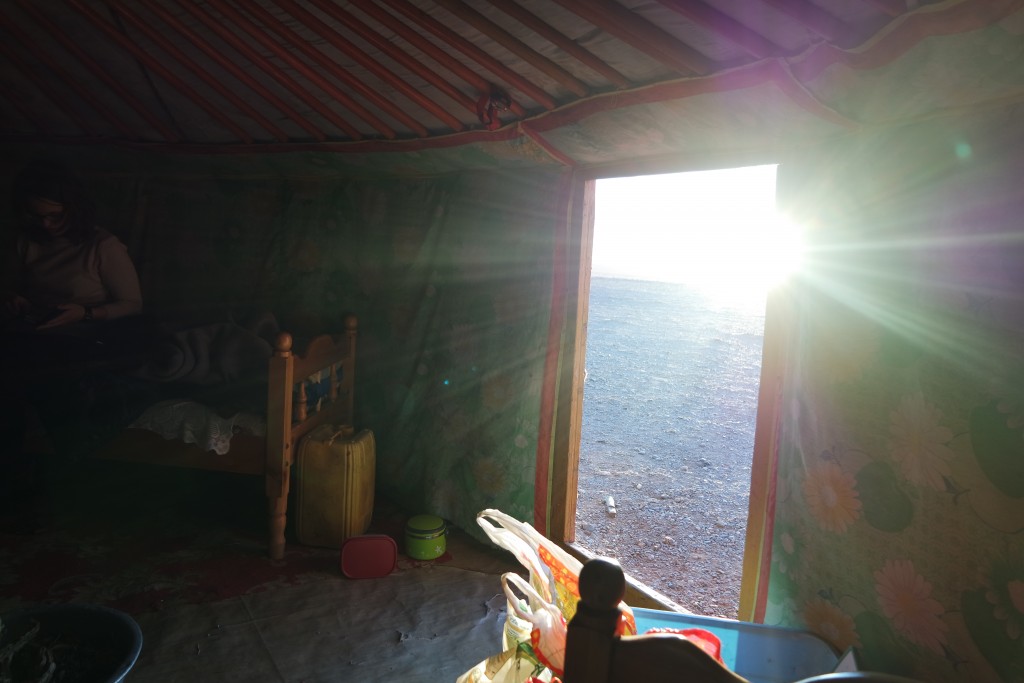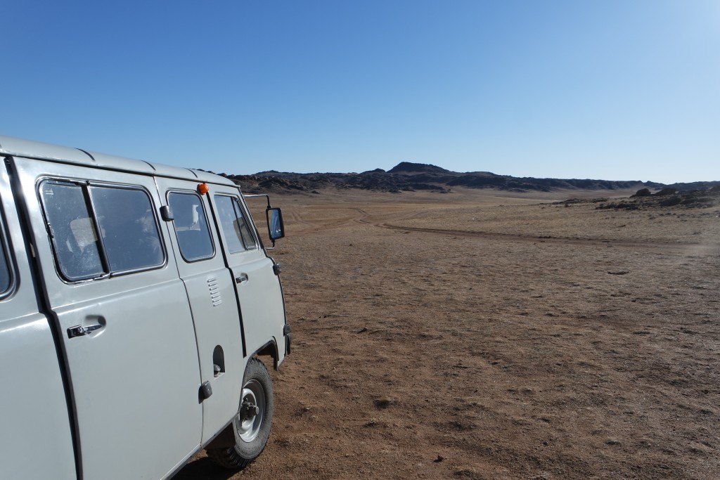 Nun brachen wir zu Naraas Familie auf, die uns kurzfristig Beherbergen sollte und zur Feier der beiden Geburtstage eine Ziege schlachtet. Der Weg dorthin war aber nicht so stringent wie es sich anhört. Es gab mehrere Unstimmigkeiten bei der Wegsuche, da ein vorhergegangener Sandsturm die Spuren öfters verwischt hat, der Russenbus blieb zweimal in Sanddünen stecken und wurde einmal mit Muskelkraft befreit. Dieser Weg versagte beim zweiten Mal, so musste Naraa etwas an der Achse rumschrauben. Danach suchten wir eine Familie um Kamelmilch und Airag zu kaufen. Dieses Unterfangen stellte sich auch als etwas schwierig heraus (bei einer Einwohnerdichte von 0,5 pro km² in der Gobi nicht überraschend). Die Sonne ging langsam unter, das Benzin wurde weniger und wir fuhren scheinbar ins unendliche Nichts und niemand wusste richtig Bescheid. Durch mehrmaliges Nachfragen bei Nomaden (die Antwort ist eine Richtung in die man dann bis zu einer Stunde fährt und hofft man findet etwas oder jemanden) haben wir doch noch unsere Besorgungen erledigen können, kam aber schlussendlich deutlich nach Sonnenuntergang bei Naraas Familie an. Diese war jedoch enorm gastfreundlich und wir haben das erste und einzige Mal in einem Haus geschlafen.
